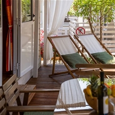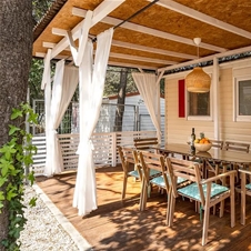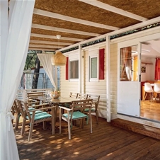 Superior mobilna hiška s 3 spalnicami: 32 m2, postelje: 4+2 (največ 4 odrasli in 2 otroka), 2 spalnici s francosko posteljo, 2 pograda (2x dolžina 1,70 m), kuhinja in dnevna soba s kavčem, kopalnica s tušem , WC, terasa 40 m2.