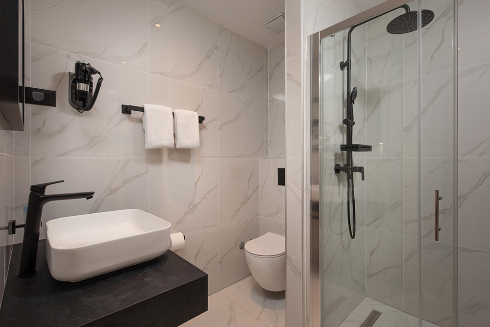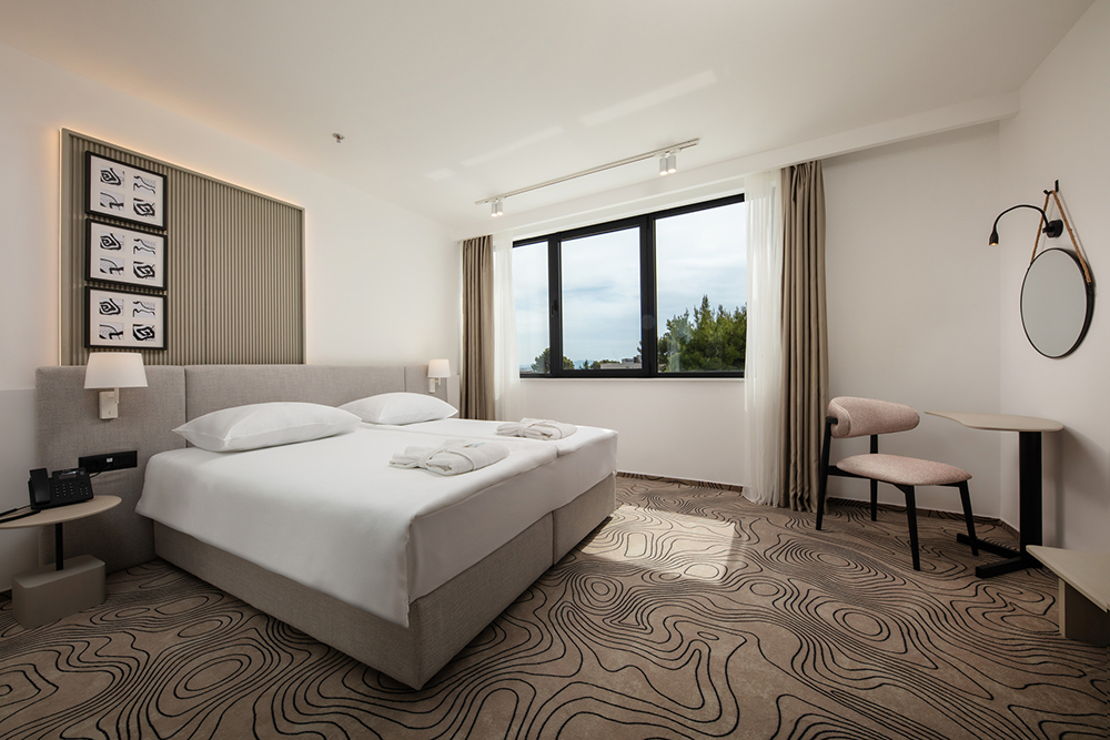 Razkošno udobje za vse, ki želijo doživeti čim več. Odkrijte prostorno sobo s pogledom na čudovito hrvaško naravo, opremljeno z udobno zakonsko posteljo ali ločenima posteljama ter možnostjo dodatnega ležišča za posebne goste. Uživajte v elegantni kopalnici, ki ponuja vse za popolno sprostitev.