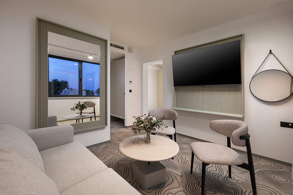 V elegantni junior suiti vas čaka popolno družinsko doživetje. Preživite kakovosten čas v prostorni dnevni sobi s svojimi najbližjimi, ponoči pa uživajte v mirnem spancu na vrhunski postelji velikosti king size. Prostorna kopalnica zagotavlja dovolj udobja za vse potrebe med oddihom.