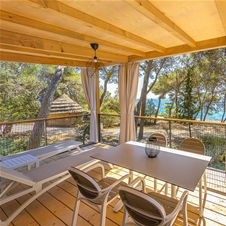 Enaka razporeditev kot pri premium hišici, vendar z dodatno prednostjo – čudovit pogled na morje. Nahaja se na atraktivni lokaciji tik ob obali, kar omogoča popolno sprostitev in edinstveno počitniško izkušnjo. Primerna za do 5 oseb.