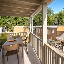 Uživajte na terasi te mobilne hiške z lastnim žarom. Poleg dveh spalnic so vam na voljo tudi dve kopalnici in kuhinja.