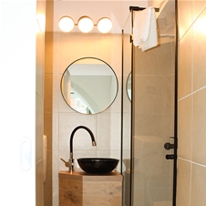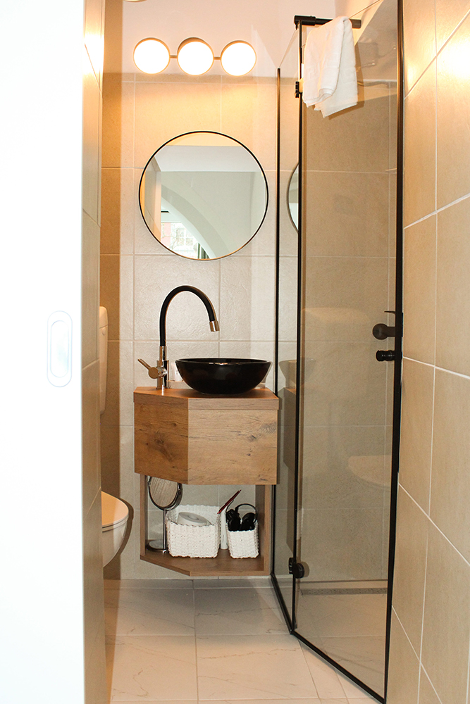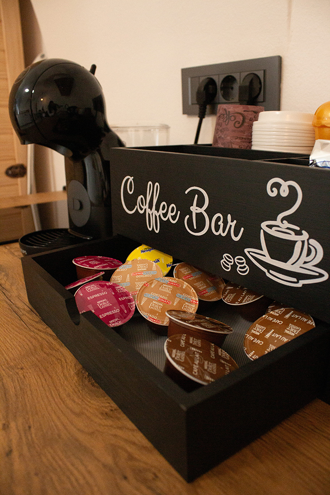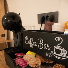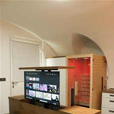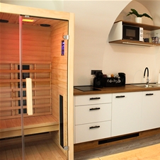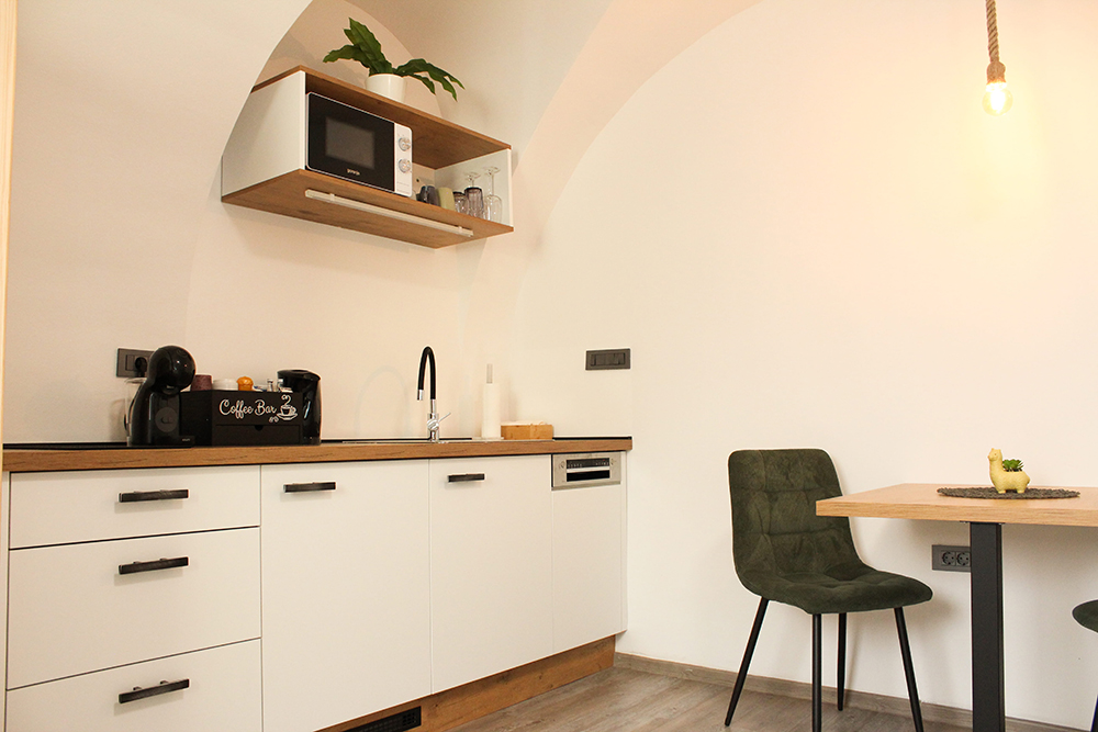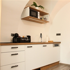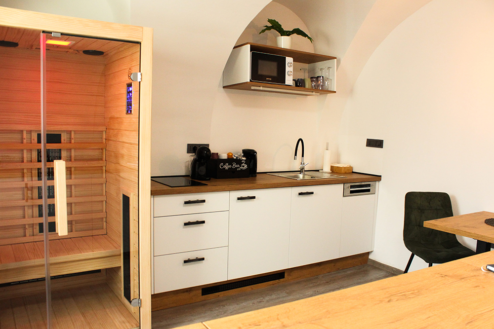 - manjšo, funkcionalno kuhinjo (grelnik vode, kavni aparat, hladilnik, mikrovalovna pečica, indukcijska plošča, posoda, kozarci, krožniki, pribor)