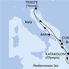 - Ponudba vsebuje: 10-dnevno skupinsko križarjenje z ladjo MSC Fantasia Trst-Katakolon-Atene-Efez-Istanbul-Krf-Bari-Trst za 1 osebo: termin 21.-30.10.2026 + 9x nočitev z razširjenim polnim penzionom v času križarjenja (zajtrk, kosilo, večerja, prigrizke, polnočni bife in gala večerja) + voda, kava in čaj čez dan iz avtomatov v samopostrežnih restavracijah, ob zajtrku tudi sokovi + namestitev v notranji kabini Fantastica (minimalna zasedenost kabine: 2 odrasli osebi; maksimalna kapaciteta kabine: 4 odrasle osebe) + pristaniške pristojbine + zabavni večerni program, predstave in animacija v organizaciji ladjarja MS + uporaba bazenov, masažnih kadi in fitnes centra ter športne aktivnosti + slovensko/hrvaški predstavnik in organizacija ter izpeljava potovanja + brezplačen peš voden izlet Barija.