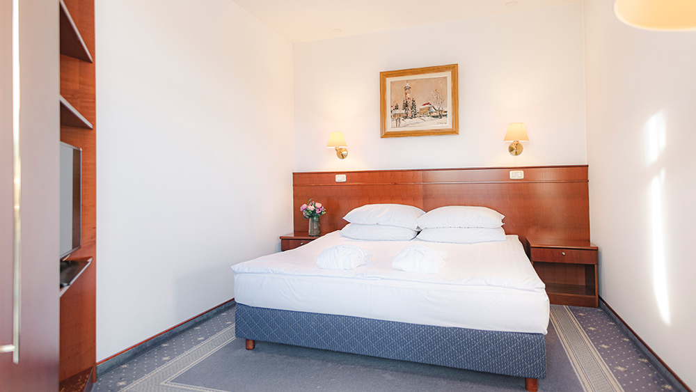 Dvoposteljna soba je velika 18-24 m2 ter opremljena s francoskim ležiščem ali ločenima posteljema, klimo, kopalnico s prho, WC, fenom, telefonom in SAT TV. Možnost 1 pomožnega ležišča ali otroške posteljice.