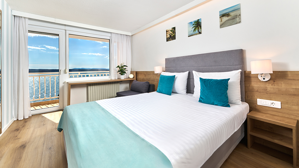 Dvoposteljna soba z balkonom in pogledom na morje vsebuje vsebuje zakonsko posteljo ali dve ločeni z možnostjo dodatnega ležišča, kopalnico s tušem, sušilnik za lase, toaletna kozmetika, brezplačen WI-FI, SAT TV in telefon z direktno linijo. Sobe so klimatizirane.