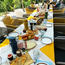 Istrski zajtrk ali večerjo vam lahko postrežemo na naši terasi pod trto ali na terasi z čudovitim razgledom na koprski in tržaški zaliv. V primeru slabega in mrzlega vremena pa imamo seveda na voljo tudi prostor v našem posebnem prostoru, kjer vam pričaramo domače istrsko vzdušje.