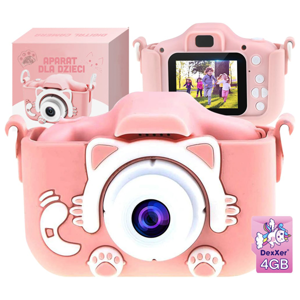 - Ponudba vsebuje: 1x otroški LCD 600mAh USB roza digitalni fotoaparat mucka + 4GB SD kartica + priložena vrvica za prenašanje kamere.