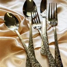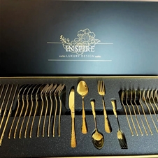 - Ponudba vsebuje: 1x 30-delni prestižni jedilni pribor Garden Bloom z motivom cvetja v zlati barvi: 6 nožev (23 cm), + 6 vilic (20,5 cm) + 6 žlic (20,5 cm) + 6 čajnih žličk (17 cm) + 6 malih vilic (17 cm). Narejeno iz nerjavečega jekla in metalizirano.