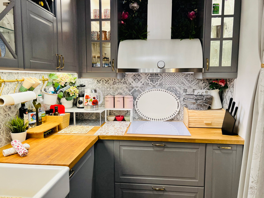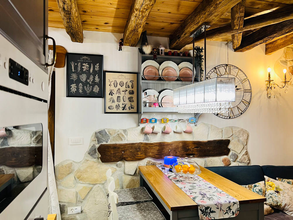 Kuhinja je popolnoma opremljena s posodo, priborom, osnovnimi začimbami in vsemi sodobnimi aparati: indukcijsko ploščo, napo, grelnikom za vodo, tosterjem, hladilnikom z zamrzovalnikom, pečico, mikrovalovno pečico, kavnim aparatom in pomivalnim strojem.