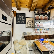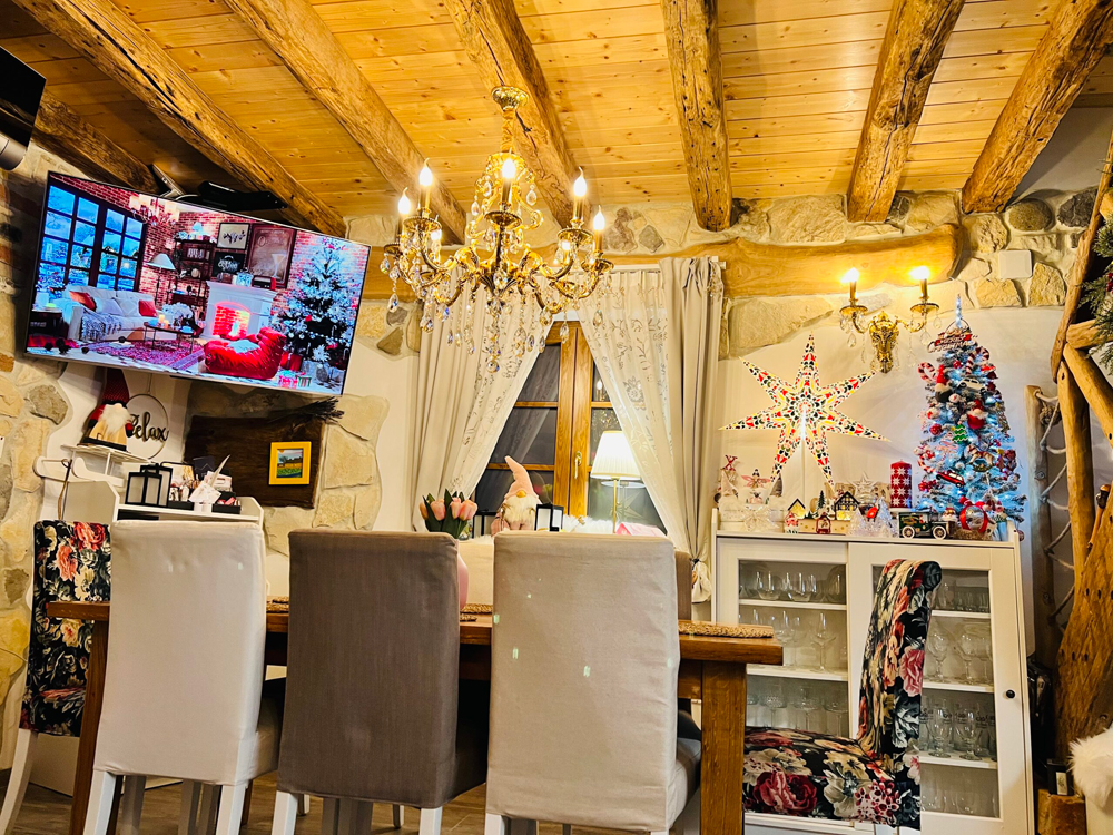 Jedilnica vključuje mizo s stoli, kamin na drva (drva so zagotovljena), otroški stolček za hranjenje ter izhod na teraso. V pritličju je nameščena klimatska naprava.