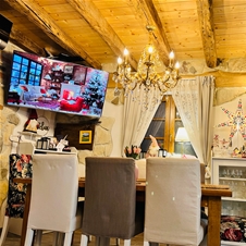 Jedilnica vključuje mizo s stoli, kamin na drva (drva so zagotovljena), otroški stolček za hranjenje ter izhod na teraso. V pritličju je nameščena klimatska naprava.