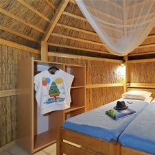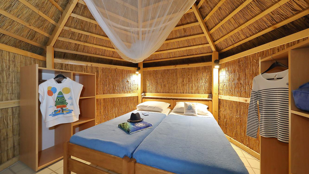 Bungalov je narejen iz naravnih materialov, ki so optimalno umešani v naravni borov gozd. Brez pretiranega vpliva na okolje bungalovi nudijo idealno priložnost, da pobegnejo iz sodobnega sloga in življenjskega ritma v nekaj naravnega in drugačnega. V bungalovu sta na voljo dve ločeni postelji, posteljnina in mreža za komarje ter dve manjši omari. Bungalov ima elektriko - USB, notranja osvetlitev, WiFi.