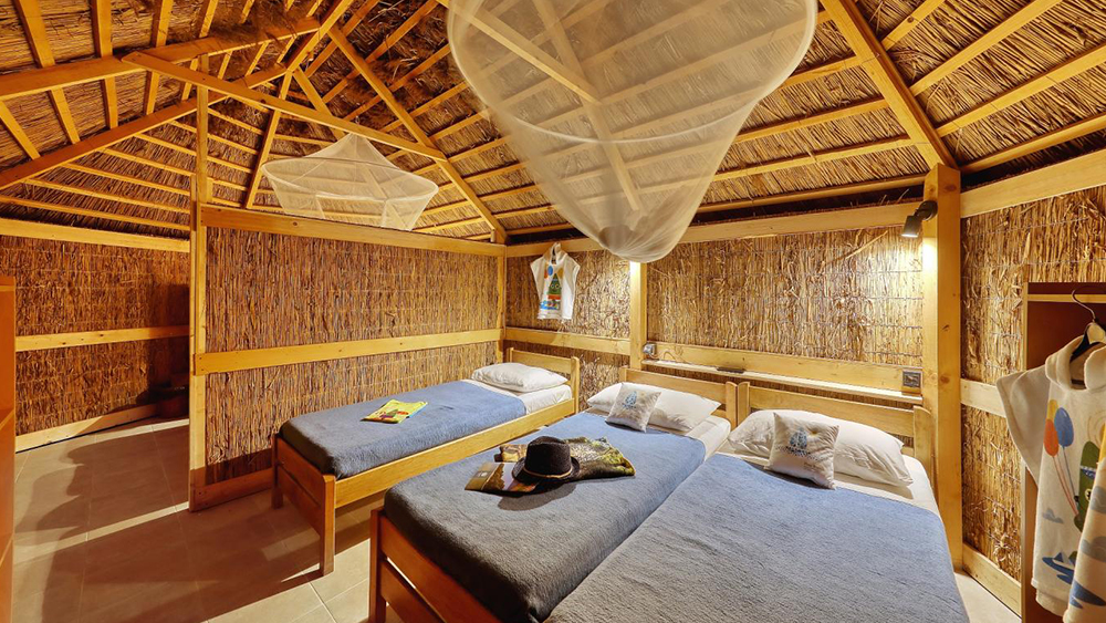 Bungalov je narejen iz naravnih materialov, ki so optimalno umešani v naravni borov gozd. Brez pretiranega vpliva na okolje bungalovi nudijo idealno priložnost, da pobegnejo iz sodobnega sloga in življenjskega ritma v nekaj naravnega in drugačnega. V bungalovu je 5 ločenih postelj, posteljnina in mreža za komarje ter tri manjše omare. Bungalov ima elektriko - USB, notranja osvetlitev, WiFi.