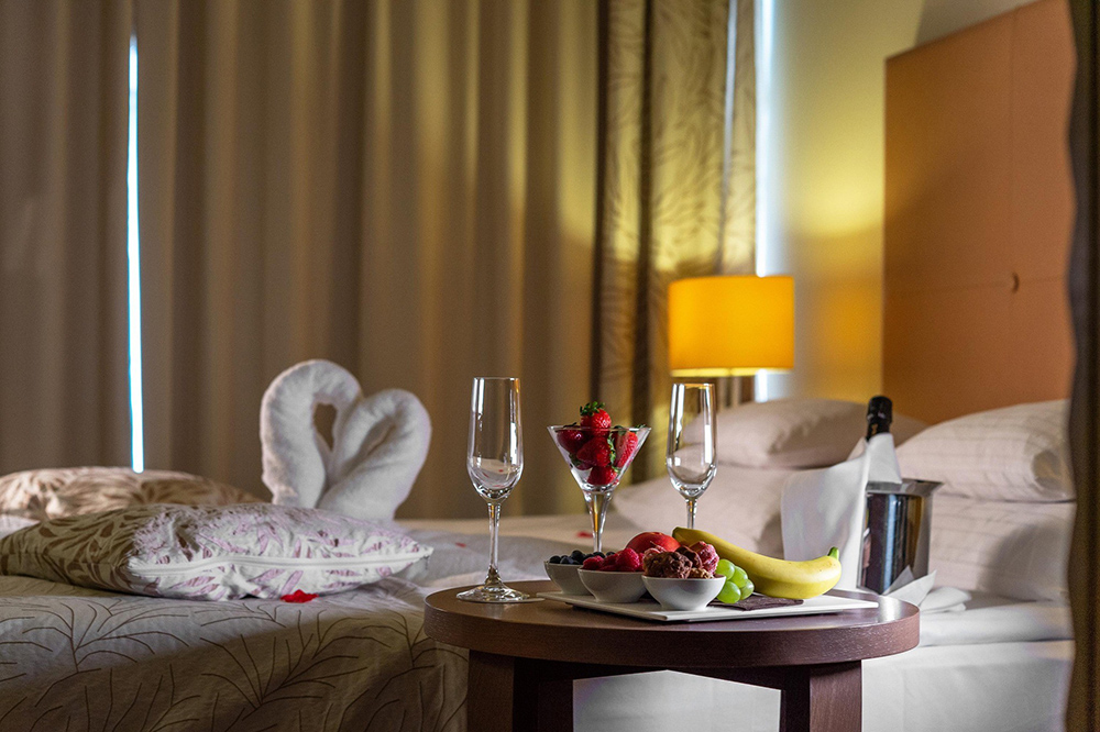 - Ponudba vsebuje: romatičen paket za 2 osebi v Grand hotelu Sava 4* superior: 2x nočitev v VALENTINOVI SUITI + dobrodošlica ob prihodu + polpenzion (bogat samopostrežni zajtrk v restavraciji Kristal, 1x romantična večerja s kulinaričnim menijem v À la carte restavraciji Kaiser, 1x večerja v restavraciji Kristal) + prost vstop v hotelski bazen Lotus s termalno vodo (28-30 °C, 2x jacuzzi 36 °C) + 1x vstop v Luksuzni ROI SPA (2h) + uporaba kopalnega plašča in brisače za kopanje + prost vstop v fitnes + bogat animacijski program + program za duhovno in športno prebujanje: vodna gimnastika, aqua aerobika + prost vstop v Hit Casino Fontana + Wi-Fi in parkirišče.