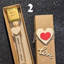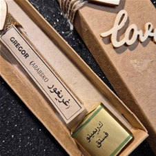 - Ob naročilu vpišite želeno ime (obdarovanca) ter številko opcije paketa, ki ga želite: 1.) manjša epruveta z 2 dubajskima pralinejema v lični darilni škatlici natur barve, z imenom obdarovanca - tudi v arabščini ALI 2.) večja epruveta z 1 dubajskim pralinejem v lični darilni škatlici črne barve, z imenom obdarovanca - tudi v arabščini.