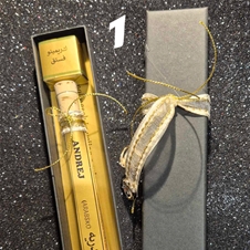 2. večja epruveta z 1 dubajskim pralinejem (mlečna čokolada s pistacijevim nadevom) v lični darilni škatlici črne barve, z imenom obadrovanca - tudi v arabščini.