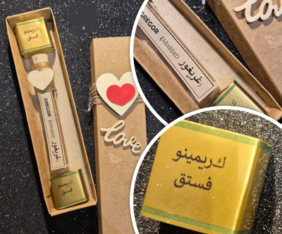 1. manjša epruveta z 2 dubajskima pralinejema (mlečna čokolada s pistacijevim nadevom) v lični darilni škatlici natur barve, z imenom obadrovanca - tudi v arabščini.