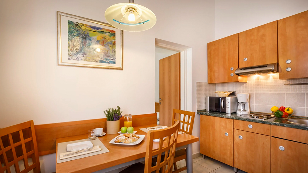 Apartma ima eno spalnico, kjer je postelja z dvema ležiščema. Ima dnevno sobo z raztegljivim kavčem, ki služi kot pomožno ležišče, mizo in pisalni stol, opremljeno kuhinjo, SAT TV, sef, telefon, kopalnico s prho in sušilnikom za lase. Vsi apartmaji so klimatizirani.