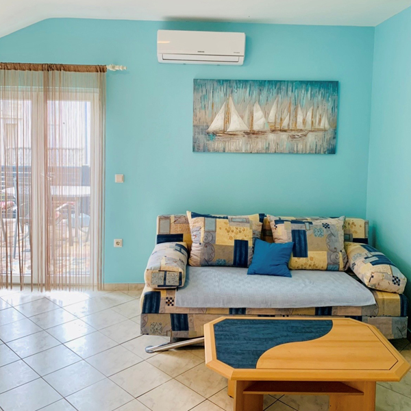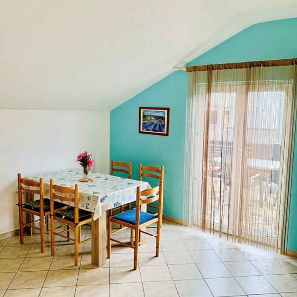 Apartma je v 1. nadstropju, površine 40 m2. Sestoji iz spalnice z zakonsko posteljo in 2 ležiščema, dnevne sobe, kompletno opremljene kuhinje, jedilnice in kopalnice. Apartma je klimatiziran, ima SAT-TV in pitno vodo, zagotovljeno parkirišče in možnost uporabe žara na dvorišču. V ceno so vključeni: poraba vode in elektrike, posteljnina, brisače in končno čiščenje.