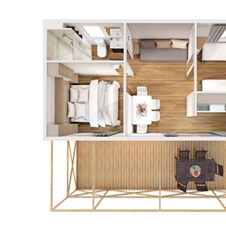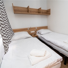 Mobilna hiška nudi prijetno in funkcionalno bivanje za udoben oddih. V hiški sta dve ločeni spalnici, ki zagotavljata dovolj zasebnosti in udobja za do štiri osebe. Na voljo je tudi posteljnina, zato je vaše bivanje brez dodatnih skrbi.
