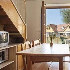 Prostoren in udoben apartma za tri osebe z zakonsko posteljo 200 x 160 v zgornjem nadstropju in dodatnim ležiščem v dnevnem prostoru, ki se nahaja v spodnjem delu apartmaja. V apartmaju (30,90m2) je kopalnica s tušem in WC-jem, kuhinjska niša in jedilna miza v spodnjem delu apartmaja ter zunanja terasa.